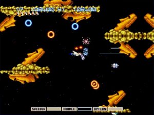 Dying pops your Options out into the field, which you have to collect again. You’ll be invincible for a short while, so it’s usually doable. However, some fast moving sections will scroll your lost Options off the screen faster than you can grab them, which will put you in a very difficult situation.