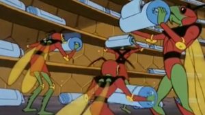 The season two episode that focuses on bug people the most is called The Good Shall Survive. In this episode an ancient race of insect people called the Tycons awake and attack the bee peoples supply of honey. The Tycons kind of remind me of Zorak from Space Ghost and the Brak Show. These skinny insect people have green skin and wear red and black uniforms. They only have four limbs, but their slender builds, insect like faces, and wings make them much more bug-like than many of the Masters of the Universe insectoid action figures.