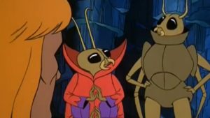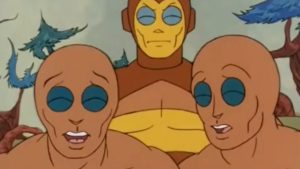 The Good Shall Survive also features the bee people. This is the race that Buzz-Off comes from, yet there are odd inconsistencies between all the bee people’s designs. Buzz-Off looks similar to his action figure having a yellow face framed by the rest of his head in brown. In the cartoon he also always wears his yellow bee hat. There are a handful of other bee people in the episode. There are some generic bee men who are bald and their entire heads are flesh-tone, while there is another character that matches Buzz-Off’s coloring but has odd “boxes” over his ears like an old fashioned Sci-Fi space helmet. The final style of bee people, which cracks me up the most is the little girls who all have British Invasion inspired hair cuts. They are bees in a Beatles wigs.