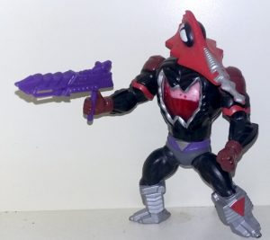 The Horde were He-Man bad guys in action figure form, but She-Ra villains in cartoon form. Mosquitor who was released after both the He-Man and She-Ra shows had ended was labeled the Evil Energy-Draining Insectoid. Mosquitor was one of the last figures released for Masters of the Universe. Mosquitor, and has a somewhat mechanical appearance. The mini-comics show Hordak experimenting on people to create Dragstor. In 1987 it was unclear if Mosquitor was a man with mechanical bug parts made by Hordak or if he was an insect man who was augmented with some mechanical parts later. Mosquitor Has a large red triangular head with a silver proboscis used to stab a victim and drain their energy. The figure has an amazing action feature that makes “blood” drip down the walls of his clear chest cavity and fill his insides with the rapid push of a button on his back. Mosquitor also came with a purple gun that seems to also be able to “bite” victims.