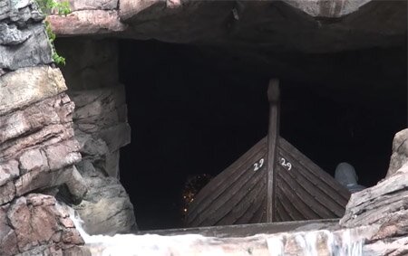 As you can see by the photo, taken by somebody outside the ride, the boat comes close to the cave’s exit, but it definitely does not hang over the edge like my memory would have me believe. Does anyone else remember the boat hanging over the edge of the cliff? Or, is it just the thought of it hanging over the cliff that was left in my mind and as a young kid that made it scarier than the reality? Or perhaps it DID hang off the cliff and they later changed the ride? Has anyone experienced this Mandela Effect?