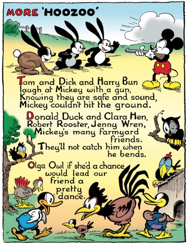 In 1932, a character called Donald Duck appeared in a British Disney children’s book. “Mickey Mouse Annual #3” In a story called “Mickey’s HooZoo”. He only appears on one page of the story, just long enough to be named as one of Mickey’s friends, but he’s there. The art there was done by Wilfred Haughton.